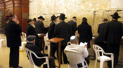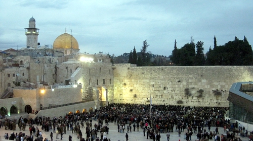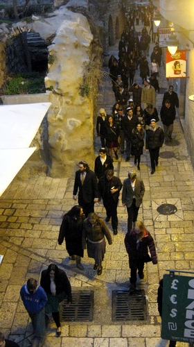| Als am späten Nachmittag das Schofar-Horn den Shabath ankündigte noch einmal ins Freie (hatte müde in der Herberge die Beine hochgelegt). Dachte, alle eilten nun mit Speisepaketen zum Sabbath-Mal. Mitnichten, Gruppen zogen fröhlich mit Gesang, erst mal nicht erkennbar wohin, durch die Gassen. Ich überließ mich dem Sog und kam wieder zur Klagemauer. Diesmal durfte vor der Mauer nicht fotogarfiert werden (wäre auch extrem indiskret gewesen); nur von der Terasse oberhalb war es möglich. Ein Gottesdienst? Nein, viele: individuell-persönliche, in Gruppen mit rabbbinischer Anleitung, in Gruppen: singend, tanzend, heiter. Vielfältiges, fröhliches Geschehen. Danach ging man dann doch zum Sabbath-Mal. | |