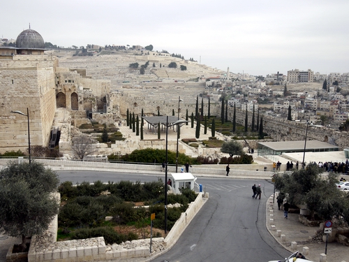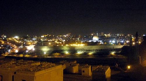 | Am Mittag hatte ich ich auf einer Terrasse am östlichen Rand der Altstadt gespeist. Blick auf den Skopusberg/Öberg. Der war dann Ziel der letzten Wanderung am Abend. Der Aufstieg zu den Moscheen auf dem Tempelberg war nicht möglich. Am Freitag Abend ist er den Muslims vobehalten. An den Eingängen kontrolliert das die israelische Polizei. Vom Skopusberg über den jüdischen Friedhof ein überwältigender Blick auf den Tempelberg und die Stadt. | |