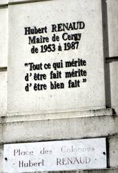 Am Ende der großen West-Ostachse liegt 27 km von Paris entfernt die Gemeinde Cergy. In den siebziger und achtziger Jahren ist dort ein neues Modell der Stadtplanung entstanden. Im Zentrum des Stadtteils St. Christophe liegt die postmoderne Place des Colonnes, die sich auf die weite Landschaft der Ile de France hin öffnet. Der israelische Künstler Dany Karavan hat dort das großartige Projekt des Axe majeur geschaffen, eine Landschaftsskulptur, die im Grunde von dem auf den Hügeln am Ufer der Oise glegenen St. Christophe bis zu La Défense und zum Arc de Triomphe reicht. An einem der Gebäude der Place des Colonnes erinnert eine Tafel an den Bürgermeister von Cergy. Das Motto seiner langjährigen Arbeit hat mich beeindruckt: "Alles, was verdient getan zu werden, verdient es gut getan zu werden" Die Zahl 12 spielt in der Anlage eine bedeutende Rolle. Es gibt zwölf 'Stationen', Beherrschend sind die zwölf Säulen, durch die sich der Blick auf die Landschaft öffnet. Eine lange Treppe führt den Hang hinunter an das Ufer der Oise, die von einer roten Metallbrücke überspannt wird. An Horizont ahnt der Blick die Türme der Défense oder sieht sie bei sehr klarem Wetter. |