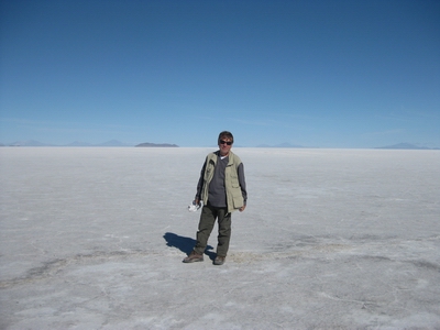 hundert Meter tief. Vor uns liege. 120 km auf der flachen Salzfläche. über der Andenkette im Osten des Solar türmen sich Wolken, die seltenen Regen ankündigen. Das Salz wird an einigen Stellen auch abgebaut. Bei so viel Weite fällt auch dem Alten das Springen nicht schwer. |
