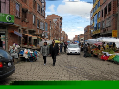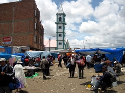 Wochenmarkt. Als Fan von Märkten, wollte ich das nicht auslassen. Es war, wieder einmal, überwätigend. Der Markt findet am Abbruch der Hochflkäche statt. Unten liegt La Paz. Im Dutzend billiger: Wer mit dem Bus von Sucre aus nach La Paz fährt, kommt duch El Alto. Mir waren dabei wenigstens fünf oder sechs solcher Kirchtürme aufgefallen, einer wie der andere. Des Rätsels Lösung: ein deutscher Geistlicher hat den Leuten alle diese Kirchen errichten lassen und dabei wohl einen Architekten einen Entwurf für alle machen lassen. |