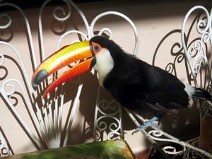 Zu dieser Stadt passt dieser emblematische Vogel, der im Patio des Hospedaje 'Resedencial Bólivar' mit einem Gesellen (einer